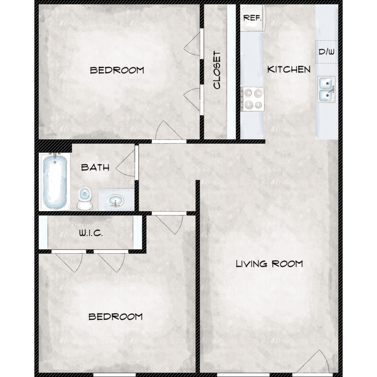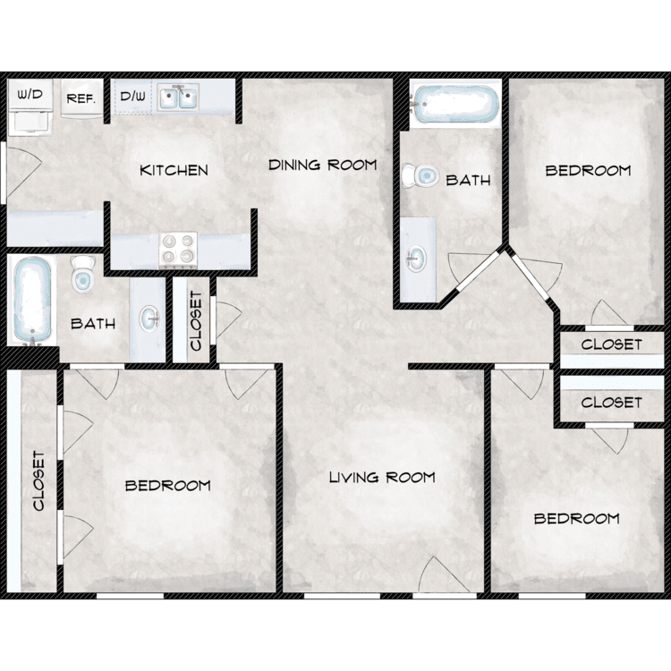 We offer spacious one, two, and three-bedroom apartments for rent. Each residence includes central air and heating, ceiling fans in the bedrooms, a pantry, a refrigerator, and walk-in closets. Also included are all paid utilities, Spectrum basic cable, and hardwired internet. Select homes feature a balcony or patio, as well as a breakfast bar.